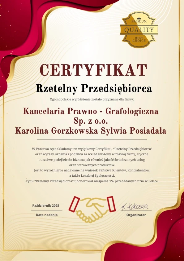 Kancelaria Prawno Grafologiczna jest laureatem licznych nagród i wyróżnień gospodarczych i społecznych. Doceniane są nasze działania na rzecz propagowania wiedzy na temat współczesnych możliwości badań pisma ręcznego, rozwój pismoznawstwa w Polsce poprzez wprowadzanie nowatorskich na naszym rynku analiz, a także organizację pełnego cyklu szkoleń z zakresu nauki badania pisma ręcznego od podstaw do zawodu.
